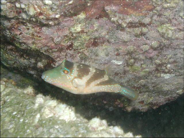 ・今週は富戸の紹介 2003年9月14日 ・天気 晴れ ![]() ・気温 31℃ ・水温 22〜25℃ ・波高 0.0m ・風 南西 ・透視度 8m ・コメント 砂地を出ていくと、産卵床は、すでに引き上げられていましたが、残骸の 土嚢などにムレハタタテダイなど付いていました。 砂地では他にトビエイ、アカエイ、イネゴチなどを見ることが出来ました。 岩場の所では、イワシ、アジ、イサキなどが群れています。さらに、イサキの 子供を襲うようにカンパチがクルクルと廻っていました。他に、ミツボシクロスズメダイ、 メイイチダイ、シロタスキベラ、トゲチョウなどゆっくりと楽しむ事が出来ました。 |