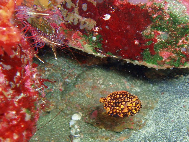 ・今週は富戸の紹介 2007年12月5日 ・天気 晴れ ![]() ・気温 15℃ ・水温 19℃ ・波高 0.0m ・風 西南西(3) ・透視度 15m〜20m ・コメント フリソデエビに誘われて行ってきました。 まだいたけど、いつまでいるかな〜(^^;) そんな中、小物はというと、イロカエルアンコウ、ベニカエルアンコウが 健在!コガネキュウセン、ネジリンボウ、オヤビッチャ、クマノミ、ミツボシ クロスズメダイ、コガシラベラ、オトメベラ、ムスジコショウダイ。 浅場には、ナンヨウツバメウオ、カスミアジなどもいて楽しい海でした。 |