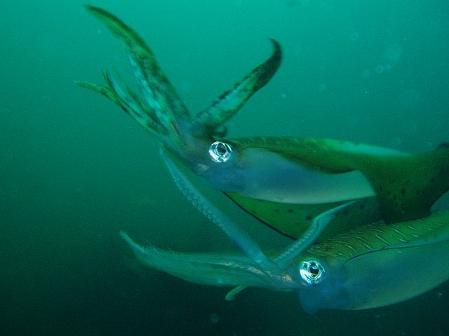 ・今週は富戸の紹介 2007年6月1日 ・天気 曇り後晴れ ![]() ![]() ・気温 20℃ ・水温 17〜18℃ ・波高 0.0m ・風 東北東(2) ・透視度 6m〜8m ・コメント 今日は、アオリイカの産卵をじっくりと見てきました。 10数杯のアオリイカが、集まって産卵していました。 他に、マハタ(yg)、ホシテンス(yg)、ベニカエルアンコウ、 カエルアンコウ、ヒフキヨウジ、ヒラタエイ、クマノミなど。 透明度が悪いのですが、じっくりと産卵を楽しんで下さい。 |