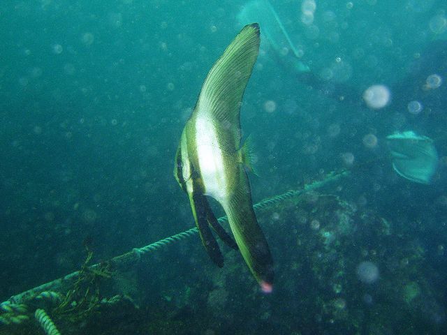 ・今週は富戸の紹介 2007年6月27日 ・天気 曇り後晴れ ![]() ![]() ・気温 23℃ ・水温 17〜19℃ ・波高 0.0m ・風 北東(2) ・透視度 8m〜20m ・コメント 数日前からヨコバマのエキジットロープの横に 網を生け簀として設置しています。中にはなんと テングダイが・・・! 定置の漁師さんが大変な作業の中、 わざわざ活かして持ってきてくれたみたいです。本当だったら 死んで人目にはふれない魚達です。海の中に突然 水族館(?)が出来たようなものですが戸惑います。 水中で見ると違和感があります。また、海が荒れた時に この網に近づくとかなり危険な気がしますので、注意が 必要でしょう。それでも、 これを利用して集客に結びつけようとするショップさんも あるようなので感想は様々です。 砂地の白のカエルアンコウは、今日もいました。他に 80cm位のヒラメ、マトウダイ、スジコウイカ(多数)、 カミナリベラの産卵風景、シマアジ、イサキやアジの群、 イワシの大群、ハナハゼ(すごく増えて綺麗です。)、 アオリイカの産卵と楽しめました。 |