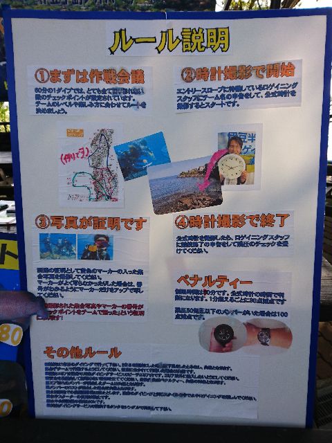 ・気温 17℃ ・水温 20℃ ・波高 0.5m 沖波 2,0m ・風 西南西(7) ・潮 満潮 12:17 (106) 小潮 ・流れ 流れ 少し うねり 少し ・透視度 15m〜20m ・コメント 「 ジオロゲイニング大会 」 |