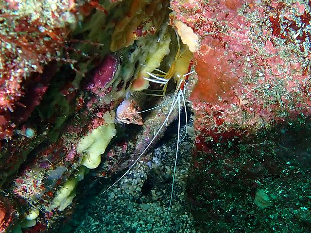 ・気温 19℃ (12:00) ・水温 21℃〜22℃ ・波高 0,8m 沖波 1,5m ・風 北東 3m/s (12:00) ・潮 干潮 10:05(64cm) 満潮 15:57(163cm) 中潮 ・流れ 流れ あり うねり あり ・透視度 8m〜12m ・コメント 「こちらも久々」 |