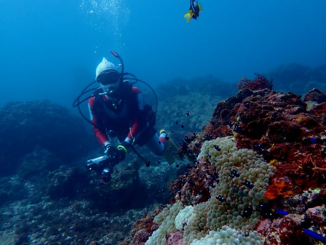 ・気温 26℃ (12:00) ・水温 20℃〜21℃ ・波高 0,0m 沖波 1,5m ・風 東 3m/s (12:00) ・潮 干潮 10:45(14cm) 満潮 17:48(145cm) 大潮 ・流れ 流れ ほとんどなし うねり なし ・透視度 5m〜8m ・コメント 「今日は少し濁っているかな」 |
