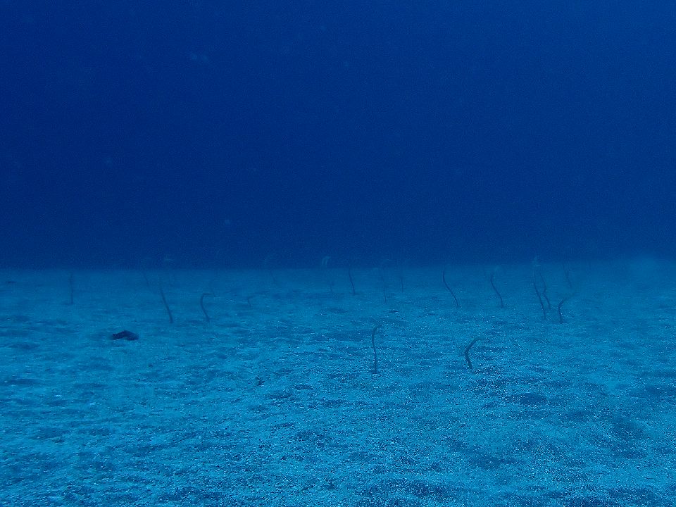 ・気温 26℃ (12:00) ・水温 26℃ ・波高 0,0m(EN/EX) 沖波 2,5mうねりを伴う ・風 東南東 4m/s (12:00) (田子) ・潮 干潮 08:58(41cm) 満潮 15:47(158cm) 中潮 ・流れ 流れ なし うねり あり ・透視度 15m〜20m ・コメント 透明度良し |