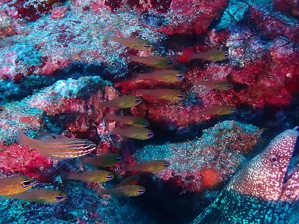 ・気温 24℃ (12:00) ・水温 18℃〜21℃ ・波高 0,5m(EN/EX) 沖波 1,5m後2、5m ・風 東北東 1m/s (12:00) ・潮 干潮 14:25(55cm) 満潮 07:54(130cm) 小潮 ・流れ 流れ 少しあり うねり 少しあり ・透視度 6m〜12m ・コメント 雨もいいかも |