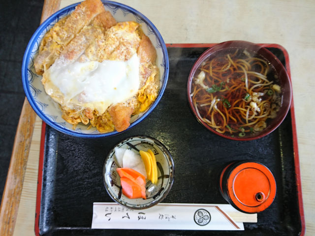 カツ丼にお新香とそば又はうどん(お椀)が付いています
