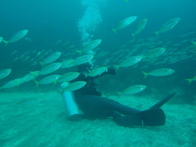 ・今週は田子の紹介 2007年9月2日 ・天気 曇り後晴れ ![]() ![]() ・気温 26℃ ・水温 24℃ ・波高 0.0m ・風 東(3) ・透視度 6〜15m ・コメント 久々の田子へ!田子島裏のリクエストです。 キビナゴのシャワーがお出迎え。それを狙ってイナダ、カンパチなどが 廻ってきます。深場ではウシエイがもうもうと砂煙をあげています。 マダイ、トビエイ、アジの群、イサキの群なども楽しめます。 トサカが綺麗ですが、どこが一番のポイントが分からずウロウロして しまいます。他にピカチューやミチヨミノウミウシ、オルトマンワラエビなど の小物なども楽しめました。 台風の影響が東の海には出始めたようです。こちらはベタベタの 海でした。 |