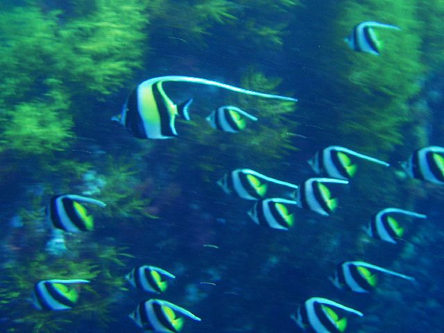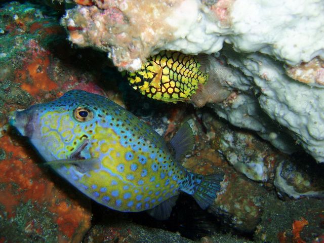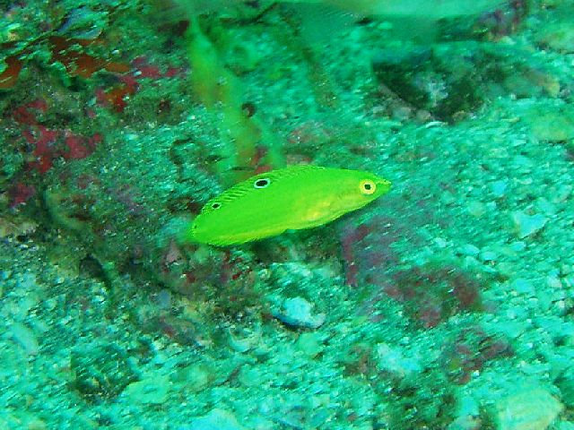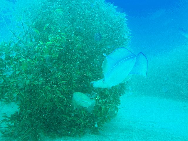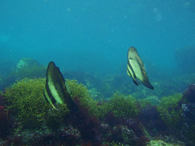 ・今週は富戸の紹介 2007年9月11日 ・天気 曇り時々晴れ ![]() ![]() ・気温 24℃ ・水温 24℃ ・波高 0.0m ・風 北北東(1) ・透視度 5〜8m ・コメント クマノミやミツボシクロスズメダイは何も変わっていないように 同じ場所にいます。他にアオヤガラ、コロダイ(yg)、ムナテンベラ(yg)、 キツネベラ(yg)、ハナタツ(yg)などが見られました。 これからは、季節来遊魚を見つける楽しみがあります。 |