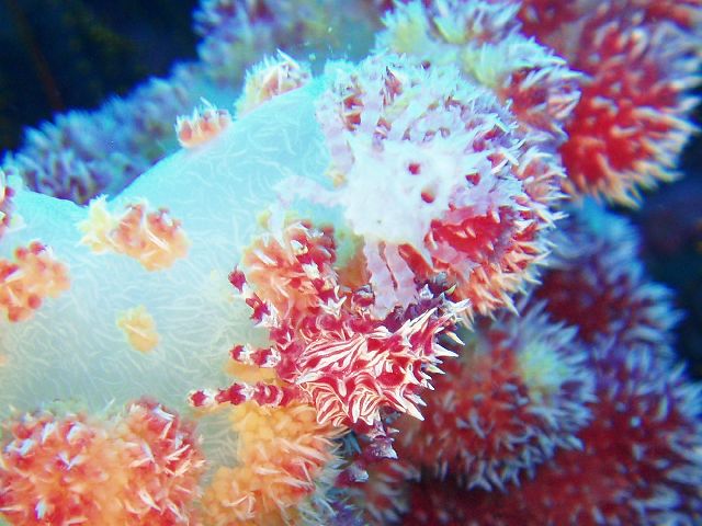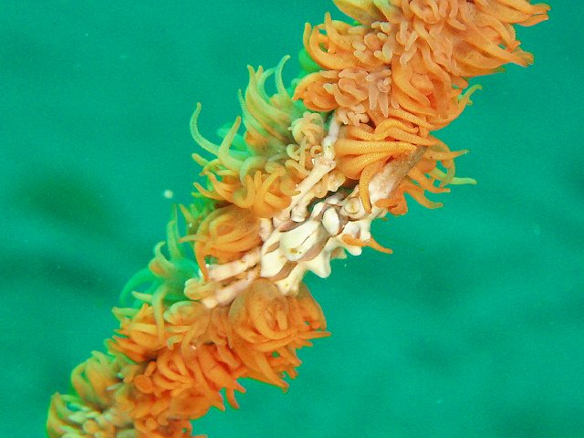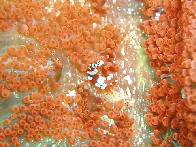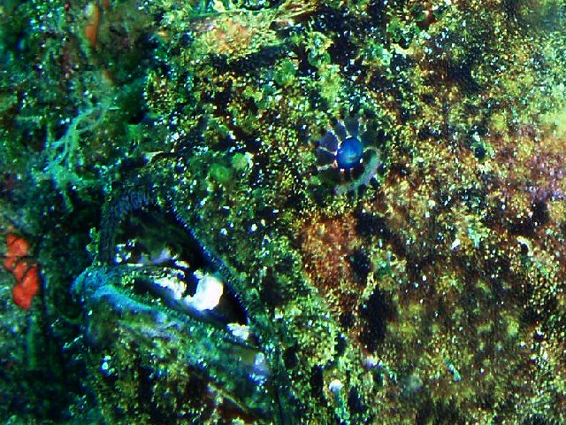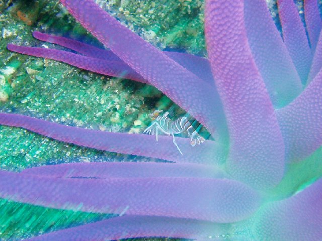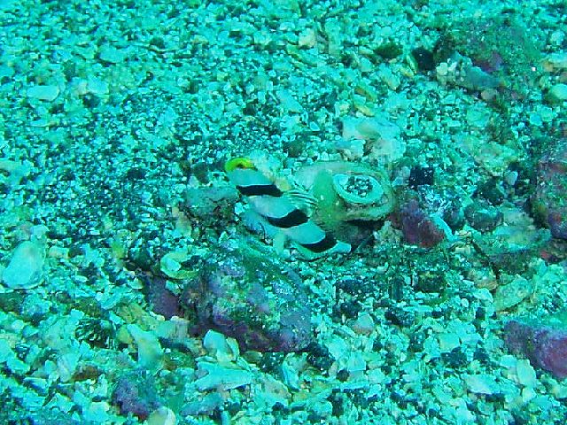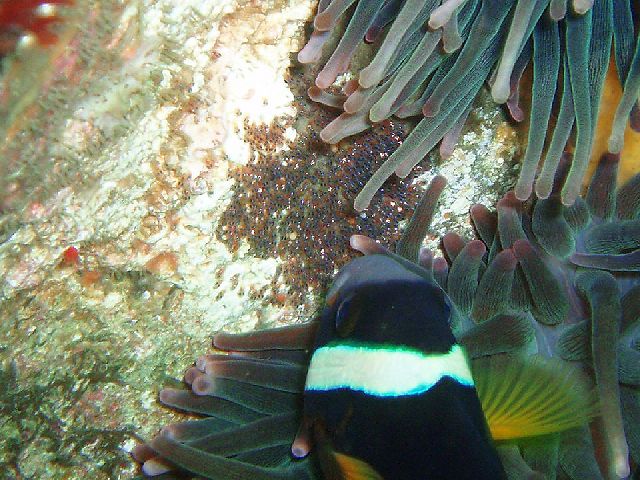 ・今週は富戸の紹介 2007年6月29日 ・天気 曇り ![]() ・気温 28℃ ・水温 17〜20℃ ・波高 0.0m ・風 西南西(8) ・透視度 8m〜12m ・コメント 浅場のクマノミのカップルは2組見られるのですが、 どちらも産卵したようです。 クマノミが忙しくイソギンチャクの一定の場所を 出入りして、ダイバーが近づくと激しく威嚇します。 イソギンチャクに触って引っ込めると卵が確認出来る と思いますが、そんな事はやめましょう。自然はあるがまま で楽しむのが良い!人為的な力を与えるのは考えものです。 写真を撮るために、生物に触ったり動かしたりすることの ないようご注意下さい。 他に、アジの群、ムツの群、アオリイカ、カエルアンコウ、 カザリイソギンチャクエビなど。 |