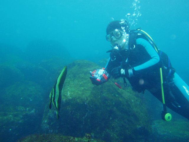 ・今週は富戸の紹介 2007年1月17日 ・天気 雨 ![]() ・気温 9℃ ・水温 15〜16℃ ・波高 0.5m ・風 北東(3) ・透視度 15m ・コメント 雨でしたが、外気は意外と寒くなく水中も快適でした。 三石方面では、タカベの群、アジの群、イワシの群、ムレハタタテダイの群を 楽しむことが出来ました。他にブリ、オオモンハタ、ミノカサゴ、ベニイザリウオや イソギンチャクモエビ、カザリイソギンチャクエビなども楽しめました。 クマノミ、ミツボシ、オヤビッチャ、ツユベラも元気にいました。 透明度も良く、いい海です。 |