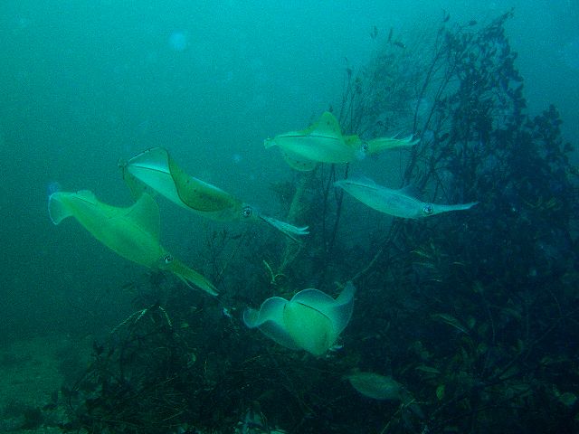 ・今週は富戸の紹介 2007年6月14日 ・天気 曇り後雨 ![]() ![]() ・気温 21℃ ・水温 18〜19℃ ・波高 0.0m ・風 南西(2) ・透視度 6m〜10m ・コメント 今日もアオリイカの産卵の集まってくる数が凄いです。2〜30杯は来ていたのでは ないでしょうか?産卵中、我々を気にすることなく超接近でした。 その他に、黄色のカエルアンコウ、ヒフキヨウジ、ホウボウ、クマノミ、タツノイトコ など。ビデオで産卵の雰囲気が伝わると思います。 |