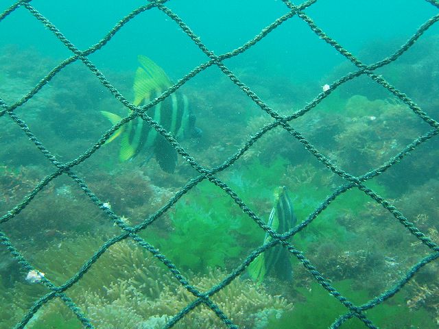 ・今週は富戸の紹介 2007年6月27日 ・天気 曇り後晴れ ![]() ![]() ・気温 23℃ ・水温 17〜19℃ ・波高 0.0m ・風 北東(2) ・透視度 8m〜20m ・コメント 数日前からヨコバマのエキジットロープの横に 網を生け簀として設置しています。中にはなんと テングダイが・・・! 定置の漁師さんが大変な作業の中、 わざわざ活かして持ってきてくれたみたいです。本当だったら 死んで人目にはふれない魚達です。海の中に突然 水族館(?)が出来たようなものですが戸惑います。 水中で見ると違和感があります。また、海が荒れた時に この網に近づくとかなり危険な気がしますので、注意が 必要でしょう。それでも、 これを利用して集客に結びつけようとするショップさんも あるようなので感想は様々です。 砂地の白のカエルアンコウは、今日もいました。他に 80cm位のヒラメ、マトウダイ、スジコウイカ(多数)、 カミナリベラの産卵風景、シマアジ、イサキやアジの群、 イワシの大群、ハナハゼ(すごく増えて綺麗です。)、 アオリイカの産卵と楽しめました。 |