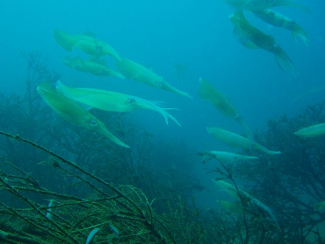 ・今週は富戸の紹介 2007年8月20日 ・天気 晴れ ![]() ・気温 31℃ ・水温 24〜27℃ ・波高 0.0m ・風 南西(1) ・透視度 8m〜10m ・コメント 久々の富戸を潜ってきました。 新しい魚も流れ着いているようですが、今は群が楽しいのでは ないでしょうか?アジ、イワシの群や小魚の群をカンパチ、イナダ が追いかけ回していました。アオヤガラも群れています。 ソラスズメダイ、オヤビッチャも群です。他にベニカエルアンコウ、オオモンカエルアンコウ、 ネジリンボウ、クマノミ、アカエイ、マハタ(yg)、コウベダルマガレイ(カップル)、 アオリイカの産卵はまだまだ大集合しています。お見逃しなく! |